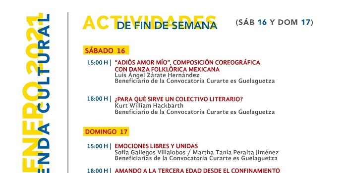 Oaxaca de Juárez, Oax. 15 de enero de 2021.- La Secretaría de las Culturas y Artes de Oaxaca (Seculta), invita al público en general a disfrutar de la programación de fin de semana, que transmitirá los videos ganadores de la convocatoria “CurArte Es Guelaguetza”, emitida el año pasado en apoyo a la comunidad artística y cultural.