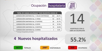 La funcionaria destacó que en relación a la ocupación hospitalaria a nivel estatal, se tienen 667 camas disponibles para atención de pacientes COVID-19, de las cuales 368 han sido ocupadas y se tiene la disponibilidad de 299, haciendo un total del 55.2% de ocupación principalmente en zonas urbanas.
