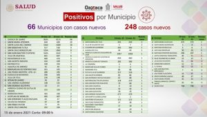 Mencionó que los 248 casos nuevos de COVID-19 se registran en 66 municipios, siendo el de Oaxaca de Juárez el que mayor número de casos presentó con 98, Santa María Atzompa 20, Santa Lucía del Camino 18, San Sebastián Tutla nueve, Cruz Xoxocotlán ocho, San Juan Bautista Tuxtepec siete, Villa de Zaachila seis; el resto cinco, cuatro, tres, dos y un caso.