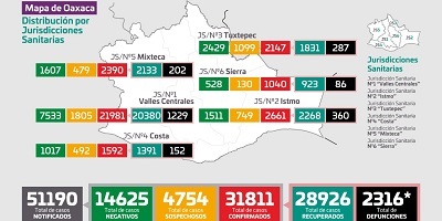 Mencionó que los 215 casos nuevos se distribuyen en 67 municipios, siendo el de Oaxaca de Juárez el que ocupa el mayor número de casos con 52, Santa Lucía del Camino 13, San Antonio Huitepec y la Villa de Zaachila nueve cada uno, Huajuapan de León ocho, Santa Cruz Xoxocotlán, Santa María Atzompa y Santiago Pinotepa Nacional siete cada uno, Salina Cruz seis, el resto cinco, cuatro, tres, dos y un caso.