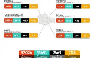 Hay 706 casos activos siendo la Jurisdicción Sanitaria de Valles Centrales la que registra 442, Mixteca 103, Istmo 57, Costa 43, Tuxtepec 42 y la Sierra 19.