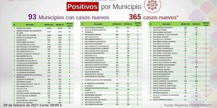 Los 365 casos nuevos afectan a 93 municipios, siendo los que mayor número de casos presentan el de Oaxaca de Juárez con 94, Huajuapan de León 36, Santa Lucía del Camino 14, Santa Cruz Xoxocotlán 13, Salina Cruz 10, Santa María Atzompa nueve; el resto seis, cinco, cuatro, tres, dos y un caso.
