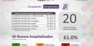 En relación a la ocupación hospitalaria de los días 8 y 9 de febrero se registraron 36 nuevos hospitalizados, hay 396 camas ocupadas y 253 disponibles de un total de 649. La Jurisdicción Sanitaria número uno Valles Centrales contabiliza 231 camas ocupadas, Istmo 62, Costa 38, Tuxtepec 33, Mixteca 29 y Sierra 3.