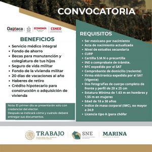 Al respecto, la titular del Servicio Nacional de Empleo en Oaxaca, Leslie Jiménez Valencia, detalló que los beneficios laborales ofertan un sueldo mensual neto de 15 mil pesos, servicio médico integral fondo de ahorro, becas de manutención y colegiaturas los hijos de los trabajadores, seguro de vida militar, 20 días de vacaciones al año, haberes de retiro y crédito hipotecario para la construcción o adquisición de vivienda.