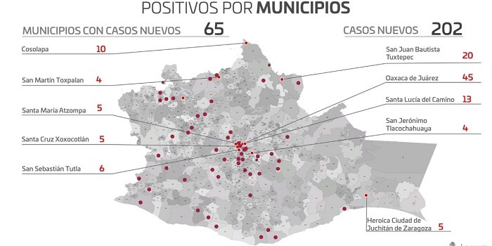 De igual forma, hay 202 casos nuevos notificados en la última jornada, distribuidos en 65 municipios, siendo los que mayor número presentaron: Oaxaca de Juárez con 45, San Juan Bautista Tuxtepec con 20, Santa Lucía del Camino con 13, Cosolapa con 10, San Sebastián Tutla con seis, así como la Heroica Ciudad de Juchitán de Zaragoza, Santa Cruz Xoxocotlán y Santa María Atzompa con cinco, respectivamente; el resto cuatro, tres, dos y un caso.