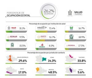 Oaxaca reportó seis hospitales al 100 % de su capacidad, así como 44 mil 063 casos acumulados de la patología infecciosa, tres mil 261 defunciones, 286 contagios activos y 40 mil 516 personas recuperadas.