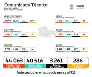La Jurisdicción Sanitaria de Valles Centrales contabiliza 30 mil 148 acumulados y mil 727 defunciones, Istmo tres mil 618 y 524 decesos, Tuxtepec dos mil 849 y 335 muertes, Costa dos mil 185 y 224 pérdidas fatales, Mixteca tres mil 728 y 312 defunciones, Sierra mil 535 y 139 fallecimientos.