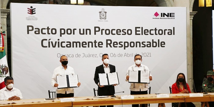 06 / 04 / 2021. El Consejero Presidente del Instituto Estatal Electoral y de Participación Ciudadana de Oaxaca (IEEPCO), Gustavo Meixueiro Nájera, firmó el Pacto por un Proceso Electoral Cívicamente Responsable, Pacto que fue signado también por el gobernador de Oaxaca, Alejandro Murat Hinojosa, y el Vocal Ejecutivo del Instituto Nacional Electoral, Edgar Humberto Arias Alba.