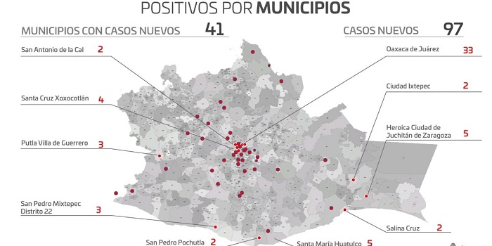 Los 97 casos nuevos se ubican en 41 municipios, siendo los que mayor número de casos que presentan: Oaxaca de Juárez con 33, Juchitán de Zaragoza y Santa María Huatulco cinco cada uno, Santa Cruz Xoxocotlán cuatro, Putla Villa de Guerrero y San Pedro Mixtepec tres cada uno, el resto dos y un caso.