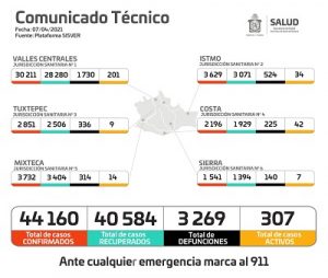 Valles Centrales registra 30 mil 211 casos confirmados y mil 730 defunciones, Istmo tres mil 629 y 524 decesos, Tuxtepec dos mil 851 y 336 muertes, Costa dos mil 196 y 225 pérdidas fatales, Mixteca tres mil 732 y 314 muertes, y la Sierra mil 541 y 140 defunciones.