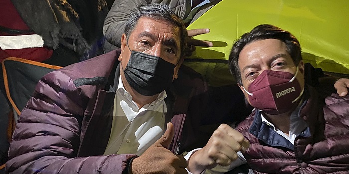 Salgado acampó la noche del martes frente a las instalaciones del INE acompañado de simpatizantes y del presidente nacional de Morena, Mario Delgado.