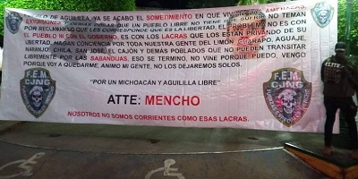 “Pueblo de Aguililla, ya se acabó el sometimiento en que vivían, las amenazas, extorsiones y demás cosas que un pueblo libre no tiene que sufrir. No teman por reclamar lo que les corresponde que es la libertad”, dice la manta firmada por “Atte: Mencho”.