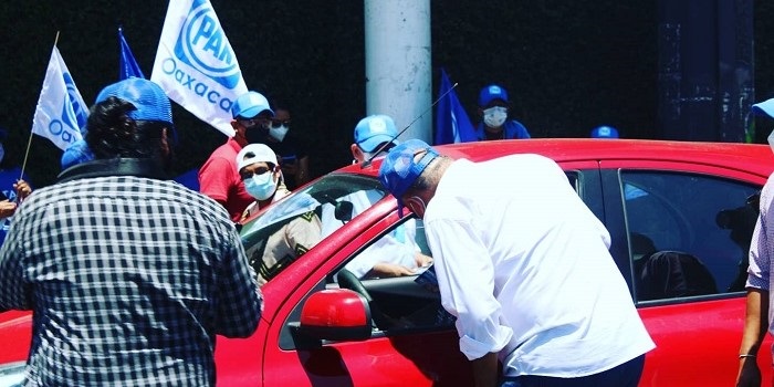 Con alegría y entusiasmo, Javier Villacaña brigadea en los cruceros de la ciudad oaxaqueña.