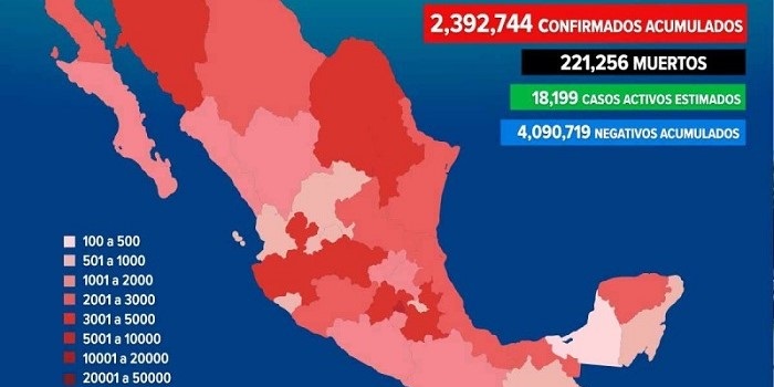 REDACCIÓN | Excélsior| 20:24 hrs.|CIUDAD DE MÉXICO. La Secretaría de Salud informó a través de conferencia de prensa que en México los casos positivos del nuevo coronavirus ascendieron a 2,392,744.