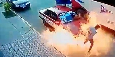El operador descendió del automóvil para confirmar la versión, en una acción instintiva abrió el cofre lo que derivó en una explosión e incendio. La explosión expulsa al chófer, quien corre a resguardarse y deja la unidad en medio del fuego. Los pasajeros salen del taxi en cuestión de segundos.