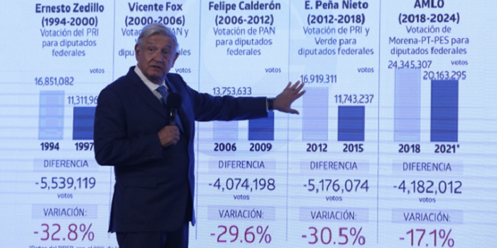 Luego presentó un comparativo de los votos obtenidos por los partidos de los cuatro anteriores presidentes, en elección intermedia, con declives de hasta 34 por ciento, en el caso de Vicente Fox.