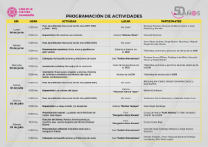 El calendario de actividades que puede ser consultado en las redes sociales institucionales de la CCO y en su página web: www.oaxaca.gob.mx/cco, está conformado por un concierto y exposiciones en sus tres galerías: “Rufino Tamayo”, “Atanacio García Tapia” y “Alfonso Rivas”, donde los artistas José Ángel Santiago, Martín Dimitrova y Manuel Jiménez exhibirán sus obras, respectivamente.