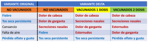 Los cinco síntomas clínicos mas habituales en la infección por SARS-CoV-2: se muestran en azul los síntomas más frecuentes de la variante original que siguen presentándose, y en rojo los síntomas que han aparecido más frecuentemente en las últimas semanas, probablemente debidos a la variante delta. Los síntomas clásicos están tomados de documentos oficiales de la OMS, los síntomas de la variante delta están tomados del proyecto Zoe británico.