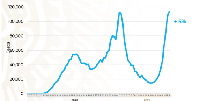 El anterior pico de la pandemia fue en la semana epidemiológica número 1 del 2021 (la primera semana de enero), cuando estábamos en la segunda ola de coronavirus y se registraron 112 mil 812 casos positivos estimados.