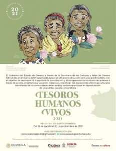 Oaxaca de Juárez, Oax. 18 de agosto del 2021. En reconocimiento a la trayectoria, contribución y compromiso comunitario de quienes a través de su vida, enseñanzas y vocación preservan y visibilizan las expresiones y técnicas culturales identitarias de las comunidades, el Gobierno del Estado a través de la Secretaría de las Culturas y las Artes de Oaxaca (Seculta) como parte del Programa de Apoyo a Instituciones Estatales de Cultura (AIEC), presenta la convocatoria Tesoros Humanos Vivos en su edición 2021.