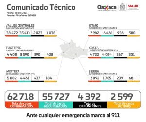 En el desglose por zona geográfica, Valles Centrales ocupa la posición número uno, con 38 mil 472 contagios, mil 38 activos y 2 mil 23 defunciones; Istmo con 7 mil 942 positivos, 580 activos y 936 decesos; Tuxtepec con 4 mil 408, 428 activos y 390 fallecimientos; Costa con 4 mil 722, 301 activos, 367 decesos; Mixteca con 5 mil 82 confirmados, 184 activos y 437 muertes; Sierra con 2 mil 92 casos, 68 activos y 239 muertes.