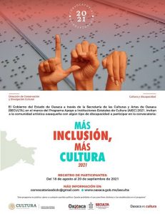 Oaxaca de Juárez, Oax. 26 de agosto de 2021. Para promover la plena inclusión y la participación efectiva en la vida cultural de personas con cualquier tipo de discapacidad, el Gobierno del Estado a través de la Secretaría de las Culturas y las Artes de Oaxaca (Seculta), invita a las y los creadores a participar en la convocatoria denominada: “Más inclusión más cultura 2021”, cuyo registro inició el 18 de agosto.
