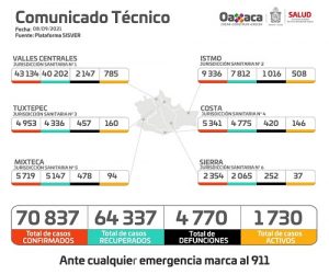 Oaxaca de Juárez, Oax., 8 de septiembre de 2021.- Al corte de este miércoles, los Servicios de Salud de Oaxaca (SSO) han notificado 415 casos nuevos de COVID-19 y 25 decesos, sumando 70 mil 837 casos acumulados y cuatro mil 770 defunciones. Además, hay mil 730 personas activas con la enfermedad en 156 municipios.