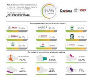 En relación a la ocupación hospitalaria, destaca la Jurisdicción Sanitaria de Valles Centrales con 75.7%, seguida de la Mixteca con 61%, Istmo 60.5%, Tuxtepec con el 58.7%, Costa 41.2% y Sierra 0%. Hay 12 hospitales al 100% de saturación; de las 509 camas destinadas para pacientes con esta enfermedad, se encuentran disponibles 181.