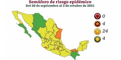 Por La Redacción| Foto: Secretaría de Salud |viernes, 17 de septiembre de 2021|CIUDAD DE MÉXICO (apro).- El país se pintó de amarillo al pasar de 13 a 24 los estados que pasaron a ese color, según el semáforo epidemiológico dado a conocer este viernes por la Secretaría de Salud (SSa).