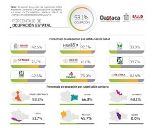 En relación a las camas ocupadas por Jurisdicción Sanitaria, sobresale el Istmo con 66.3%, Valles Centrales con 58.2%, la Mixteca con un 45.7%, seguido de Tuxtepec 43.1%, y Costa 31.7% , haciendo un global del 53.1%.