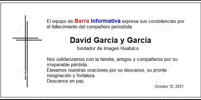 Barra Informativa envía su pésame a familiares del compañero periodista David García y García por su fallecimiento. Fundador de Imagen Huatulco. Descanse en paz.