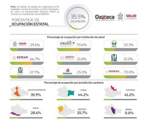 Por Jurisdicción Sanitaria, la capacidad hospitalaria del Istmo presentó 44.2%, mientras que Tuxtepec 41.2%, en tanto Valles Centrales 35.9%, Costa y la Mixteca con 28.6% y 25.7% respectivamente, la Sierra se mantiene en 0%.