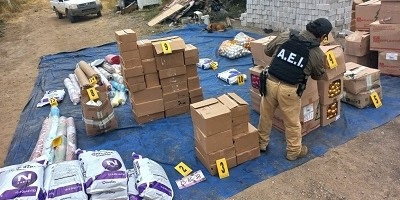 Durante el cateo se aseguraron bolsas que contenía la droga denominada marihuana, así como mercancía probablemente robada, consistente en fertilizante, neumáticos, tanques de gas y oxígeno, entre otros bienes.