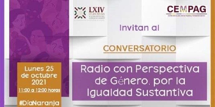 San Raymundo Jalpan, Oax. 22 de octubre de 2021.- Radio con Perspectiva de Género, por la Igualdad Sustantiva, es el Conversatorio virtual que realizará el Congreso del Estado de Oaxaca este 25 de octubre de 2021, en el marco del Día Naranja por la eliminación de las violencias contra las mujeres.