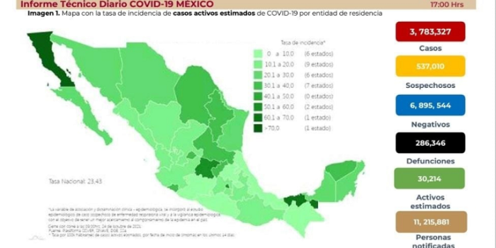 18:15 Emir Olivares Alonso|La Jornada. En México se han confirmado 3 millones 783 mil 327 casos de Covid-19 hasta el día de hoy, así como 286 mil 346 defunciones relacionadas a esa enfermedad, reportó la Secretaría de Salud federal (Ssa).