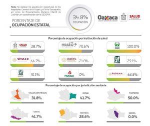 En tanto, la red hospitalaria para COVID-19 en Oaxaca, se encuentra de manera general al 34.8% de ocupación, ya que durante la última jornada se reportaron tres nuevos ingresos, para un total de 146 personas que se encuentran recibiendo atención especializada.