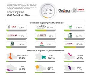 Oaxaca de Juárez, Oax. 18 de noviembre de 2021.- La demanda de atención en la red hospitalaria para pacientes con complicaciones por COVID-19 mantiene una tendencia constante, tras reportar este 18 de noviembre 76.5% de disponibilidad de camas en general, ello de acuerdo con la base de datos de los Servicios de Salud de Oaxaca (SSO).