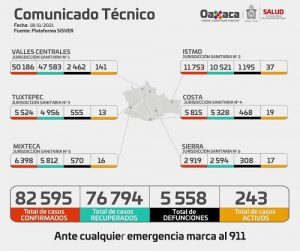 Por distribución geográficas los casos positivos y defunciones se distribuyen de la siguiente manera: Valles Centrales sumó para este jueves 50 mil 186 confirmados y dos mil 462 decesos, Istmo 11 mil 753 confirmados y mil 195 defunciones, Tuxtepec cinco mil 524 confirmados y 555 fallecimientos, Costa cinco mil 815 confirmados y 468 decesos, Mixteca seis mil 398 confirmados y 570 muertes, Sierra dos mil 919 confirmados y 308 defunciones.