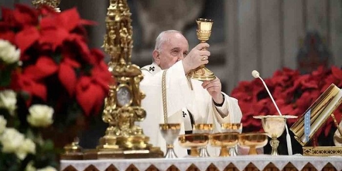 Francisco, al iniciar la novena Navidad de su pontificado,celebró una solemne misa de vigilia en la Basílica de San Pedro para unas 2 mil personas, con la participación restringida por covid-19 a alrededor de una quinta parte del aforo de los años de antes de la pandemia.