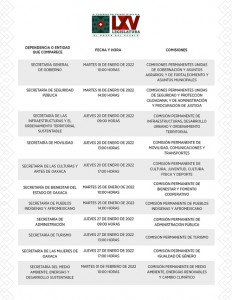 El martes 25 de enero, corresponde a la Secretaría de Bienestar (Sebien), a las diez de la mañana y la Secretaría de los Pueblos Indígenas y Afromexicano, a las dos de la tarde. El jueves 27 de enero, comparecerá a las nueve de la mañana, la Secretaría de Administración; a la una de la tarde, la Secretaría de Turismo y a las cinco de la tarde, la Secretaría de las Mujeres de Oaxaca (SMO).