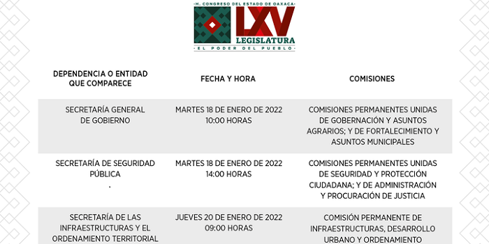 Iniciarán las comparecencias el martes 18 de enero, a las diez de la mañana con la Secretaría General de Gobierno (Segego) y a las dos de la tarde, la Secretaría de Seguridad Pública. Esa misma semana, pero el jueves 20 de enero, a las nueve de la mañana comparecerá el titular de la Secretaría de las Infraestructuras y el Ordenamiento Territorial Sustentable (Sinfra); a la una de la tarde, la Secretaría de Movilidad (Semovi) y a las cinco de la tarde, la Secretaría de las Culturas y Artes de Oaxaca.