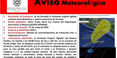 Oaxaca de Juárez, Oax., 28 de mayo de 2022.- La Coordinación Estatal de Protección Civil de Oaxaca (CEPCO) informa que se ha formado la Tormenta tropical “Aghata” en el Océano Pacífico y continúa intensificándose, por lo que podría convertirse en Huracán.