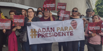 A su arribo a la ciudad fronteriza, un grupo de ensenadenses se pronunció por su candidatura a la presidencia de México en el proceso electoral de 2024, al corear: «Presidente», pancartas en mano, con la leyenda «Adán para presidente».