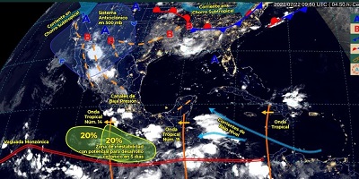 Señaló que lo anterior se deberá a la interacción de la onda tropical con el calentamiento diurno y el efecto orográfico; esta mañana, se localizaba al occidente de la Península de Yucatán y se movía hacia al oeste a 20 kilómetros por hora.
