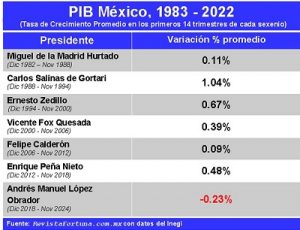 En los últimos 40 años, la tasa de crecimiento promedio en los primeros 14 trimestres de cada sexenio, con Salinas de Gortari, el PIB creció poco más de 1.0%. Con Zedillo, con todo y la crisis de 1995 por el llamado “error de diciembre” avanzó 0.67%, con Peña Nieto la economía aumentó 0.48%.
