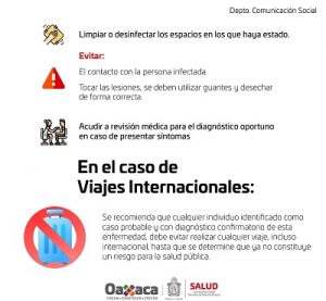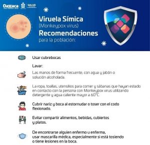 En este sentido recomendó a la población las siguientes medidas de prevención como: el uso correcto del cubrebocas, evitar el contacto con la persona infectada y tocar las lesiones; lavar frecuentemente las manos con agua y jabón, también la ropa, toallas, utensilios para comer y sábanas que hayan estado en contacto con la persona con Monkeypox virus utilizando detergente y agua caliente mayor a 60°C.