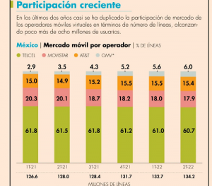 De acuerdo con datos de la consultora The Competitive Intelligence Unit (The CIU), al segundo trimestre del 2022, los OMV representaron 6% de las 134 millones 153,000 líneas móviles existentes en el país, cuota 2.5 puntos porcentuales superior a la del corte del segundo trimestre del 2021.
