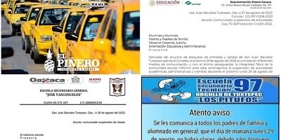 Redacción El Piñero|Tuxtepec, Oaxaca agosto 28, 2022, 3:22 pm. — Hasta las 15:00 horas de este domingo –28 de agosto– tres instituciones educativas han suspendido clases para este lunes -29 de agosto—debido a los bloqueos que el gremio taxista de esta ciudad pretende establecer en diversos cruceros y vialidades.