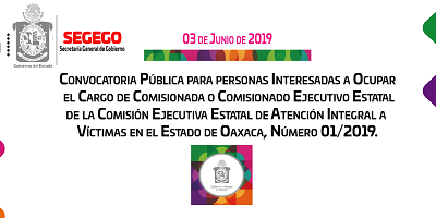 Oaxaca de Juárez, Oax. 31 de agosto de 2022.- En el marco de la Ley General de Víctimas y en cumplimiento al Artículo 92 de la Ley de Víctimas del Estado de Oaxaca, el 29 de agosto de 2022, el Gobernador del Estado de Oaxaca, Mtro. Alejandro Murat Hinojosa, emitió la Convocatoria Pública para personas interesadas a ocupar el cargo de Titular de la Comisión Ejecutiva Estatal de Atención Integral a Víctimas y a los Colectivos de Víctimas, Expertos y Organizaciones de la Sociedad Civil Especializadas en la materia, en el Periódico Oficial del Gobierno del Estado.