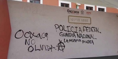 Pablo Hernández/Quadratín Oaxaca/OAXACA, Oax. 26 de septiembre de 2022, 18:12.- Los ocho años de la desaparición de 43 normalistas de Ayotzinapa sirvieron de marco para actos de vandalismo en la ciudad de Oaxaca.